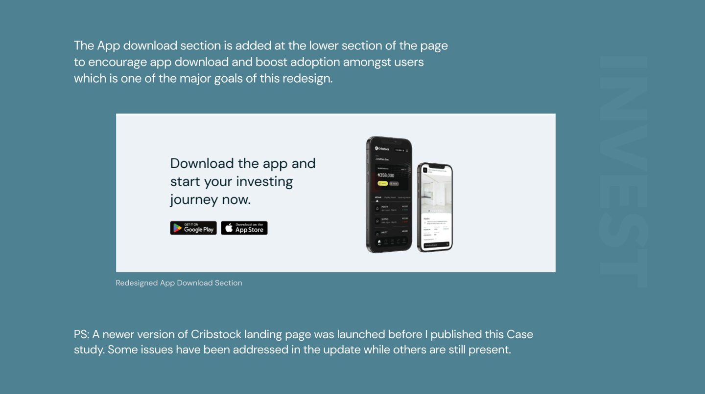 In my redesign I use this section to display the product (cribstock dashboard) on a mock-up. I also composed clearer copy for the hero section. This allows users understand that Cribstock is simply a platform to co-own properties.